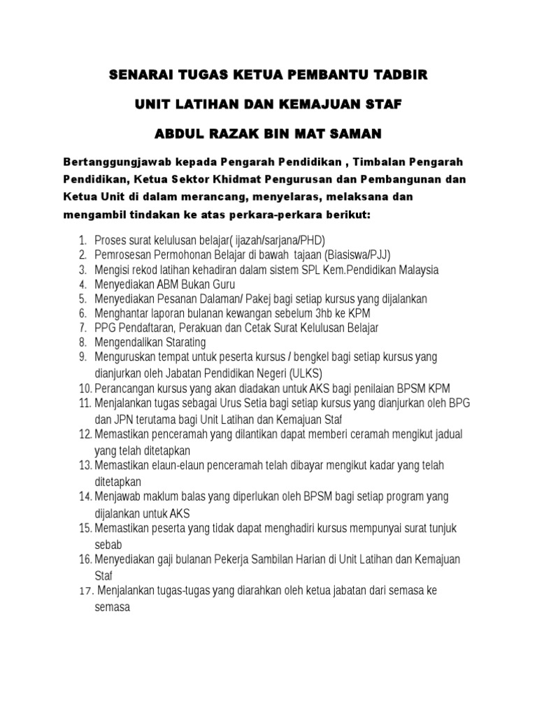 Senarai Tugas Ketua Pembantu Tadbir Pdf